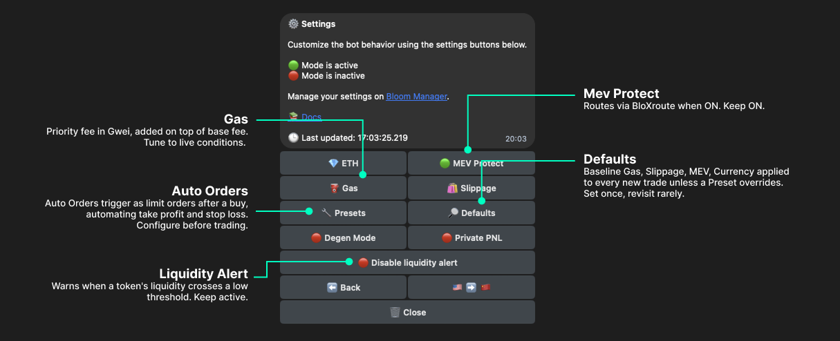 - **Gas.** Priority fee in Gwei, added on top of base fee. Tune to live conditions. - **MEV Protect.** Routes via BloXroute when ON. Keep ON. - **Presets.** Saved parameter sets for Buy, Sell, Auto Orders, Copy, AFK, Twitter. Auto Orders trigger as limit orders after a buy, automating take profit and stop loss. Configure before trading. - **Defaults.** Baseline Gas, Slippage, MEV, Currency applied to every new trade unless a Preset overrides. Set once, revisit rarely. - **Liquidity Alert.** Warns when a token's liquidity crosses a low threshold. Keep active.