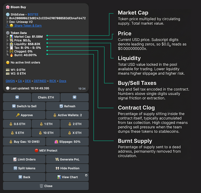 When Bloom surfaces a token, the data block shows the following fields: - **Market Cap.** Price multiplied by circulating supply. Total market value. - **Price.** Current USD price. Subscript digits denote leading zeros: *$0.0₈* reads as *$0.000000000x*. - **Liquidity.** USD locked in the pool available for trading. Lower liquidity means higher slippage and higher risk. - **Tax B / S.** Buy and Sell tax encoded in the contract. Above single digits usually signals friction or extraction. - **Clogged.** Percentage of supply sitting inside the contract, usually accumulated from tax. High clogged means pending sell pressure when the team dumps it. - **Burnt.** Percentage of supply sent to a dead address, permanently removed from circulation. This card is your first filter. Tax, Liquidity, and Clogged are the three numbers that tell you most of what you need to know before the first click.